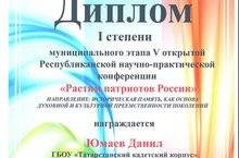 Поздравляем нашего воспитанника Юмаева Данила и нашего педагога - организатора Морозову Т.И. с Победой на Муниципальном этапе V открытой Республиканской научно-практической конференции "Растим патриотов России"!