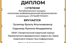 Поздравляем наших воспитанников - Гусамова Булата и Садыкова Румиля- с победой в республиканском конкурсе " Галактика информационной безопасности" в номинации " Лучший плакат"!