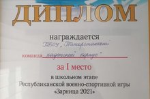 13 апреля 2021 года сборная команда ребят нашего корпуса под руководством Валиева Ильнура Хисамутдиновича приняла участие в школьном этапе Республиканской военно- спортивной игры "Зарница 2021" и стала Победителем!