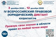 Ассоциация юристов России проведет в онлайн-режиме IV Всероссийский правовой (юридический) диктант. В течение недели, с 3 по 10 декабря, каждый гражданин России сможет проверить свои юридические знания на сайте "юрдиктант.рф". Диктант рассчитан на граждан в возрасте от 14 лет. Каждый, кто пройдет тест, получит сертификат о прохождении диктанта с персональным результатом, а также доступ к информационным материалам по допущенным ошибкам. Таким образом, человек не только проверит свои знания, но и чему-то научится.