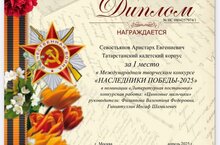 Поздравляем Севостьянова Аристарха и руководителей Филиппову В.Ф. и Гиниятуллина И.Ш. с победой в Международном творческом конкурсе «Наследники Победы-2025!»