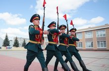 В шествии приняли участие три взвода: кадеты 21 взвода несли флаг России, кадеты 23 взвода – флаг РТ, ребята 25 взвода – флаг Нижнекамского района.