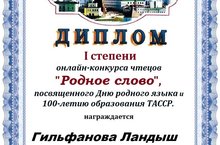 26.04.2020 Ученица 3А класса - Гильфанова Ландыш, приняла участие в онлайн конкурсе чтецов "Родное слово", который был посвящен 100-летию ТАССР. Поздравляем с 1 местом! Классный руководитель Агмалова И.Р.