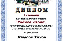 26.04.2020 Поздравляем с 1 местом Паюсова Тихона, который принял участие в онлайн-конкурсе чтецов "Родное слово". Классный руководитель Агмалова И.Р.