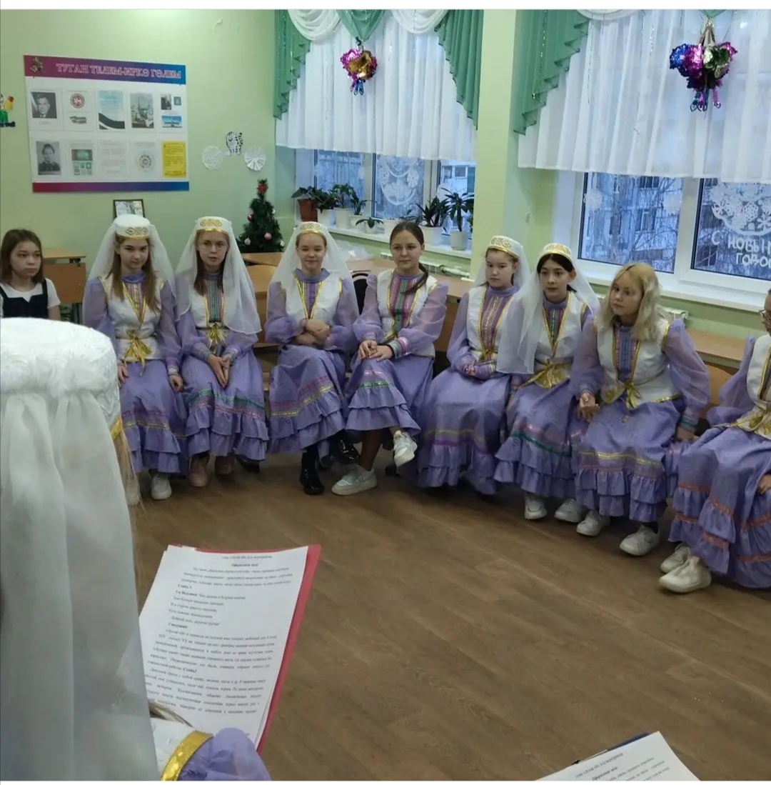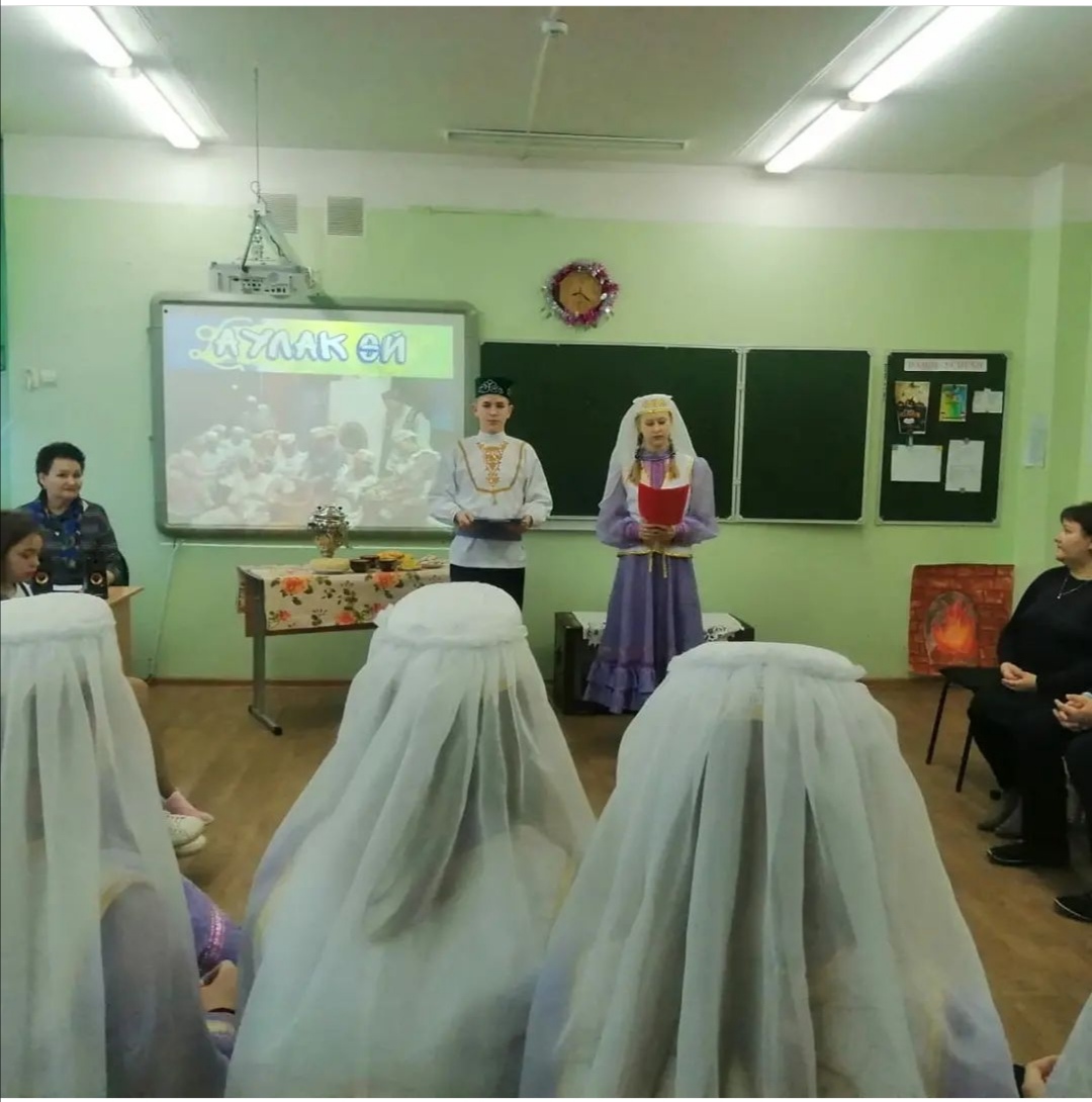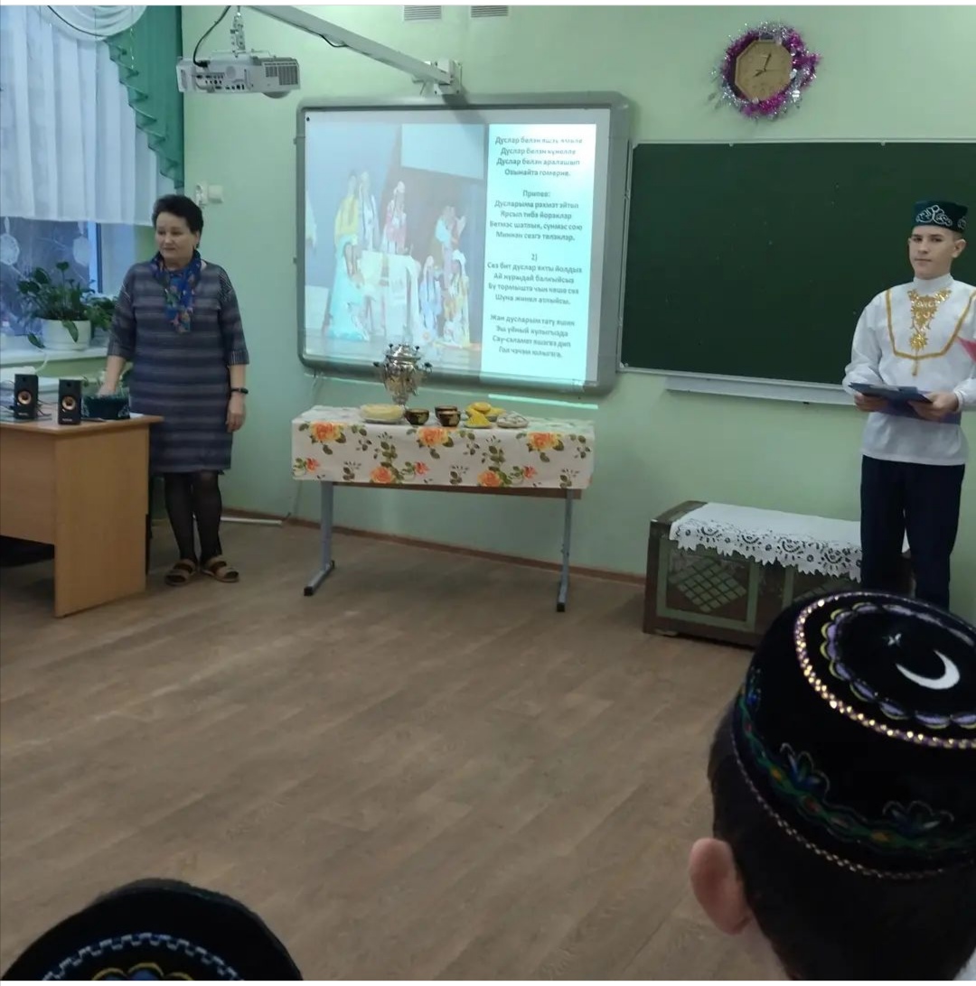 Учителя родного языка и литературы Хусаинова Э. А. и Хайруллина Л. А. провели мероприятие ("Посиделки - Аулак ой")в 7Б классе, посвященное окончанию Года родных языков и народного единства в Республике Татарстан.