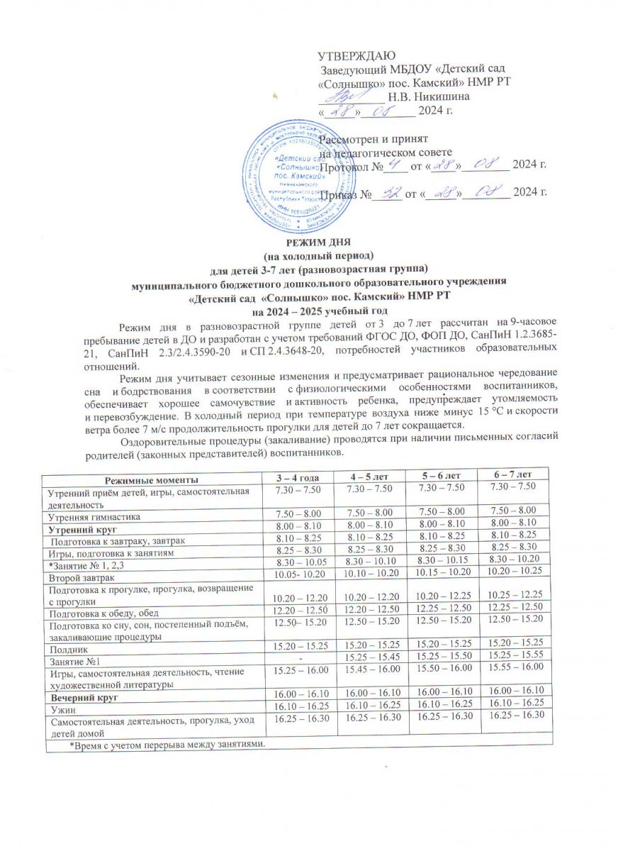 Режим дня для детей разновозрастной группы на 2024 - 2025 учебный год
