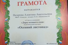 Воспитатель нашей гимназии Назарова А.А.приняла участие в региональной выставке "Осенний листопад" и в номинации "Дары осеннего сада" заняла 2 место. Выставка проходила в городе Набережные Челны. Спасибо Алевтине Анатольевне за активное участие в конкурсе