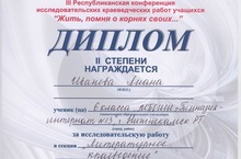 Поздравляем ученицу 6 класса Иванову Лиану и научного руководителя Жданко С.Д. с получением диплома 2 степени на III республиканской конференции исследовательских краеведческих работ учащихся. Молодцы!