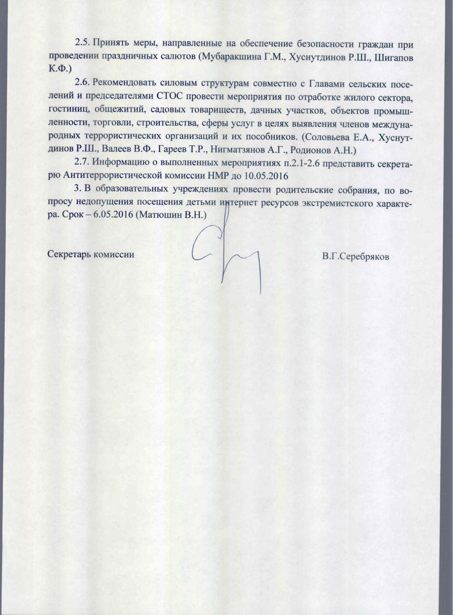 Решение №1 заседания Антитеррористической комиссии Нижнекамского муниципального района от 15 апреля 2016 г. (продолжение)