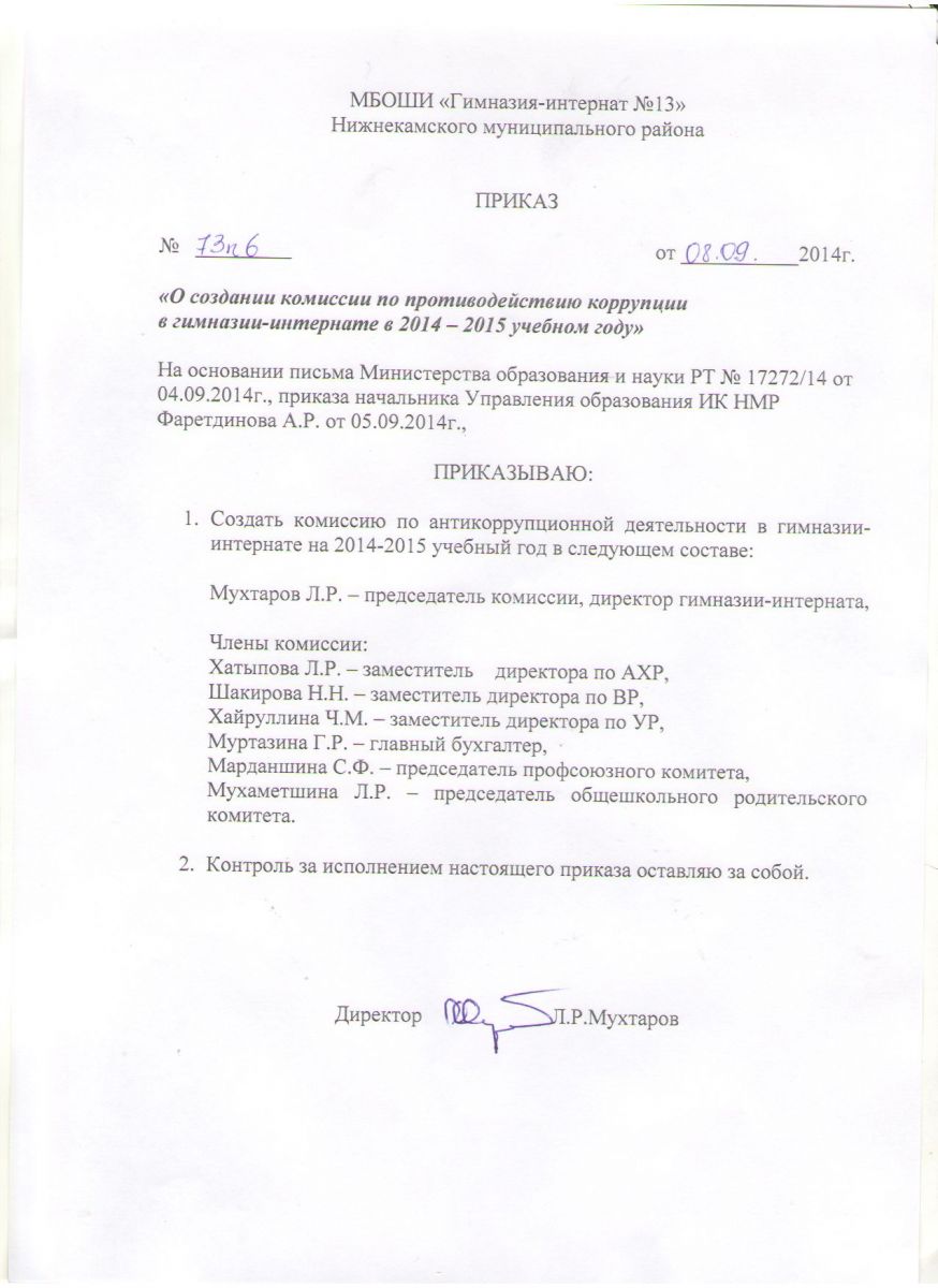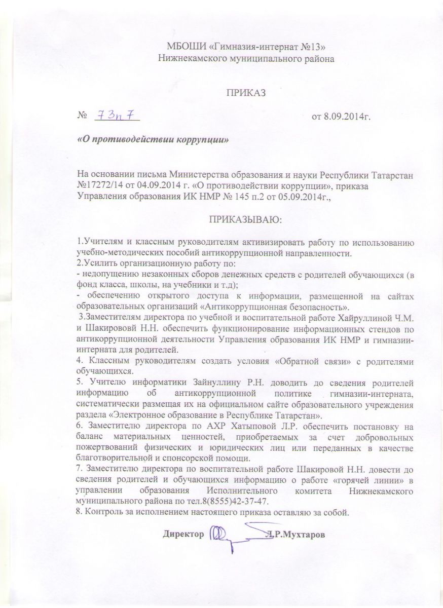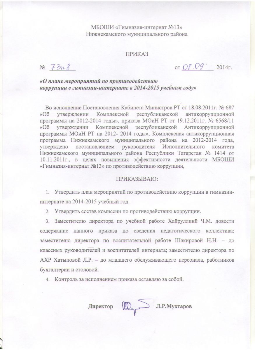 Приказ и план мероприятий по противодействию коррупции в УО на 2014г