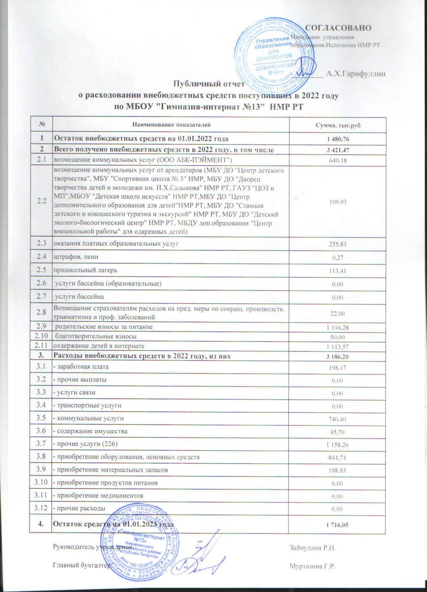 Публичный отчет о расходовании внебюджетных средств поступивших в 2022 году