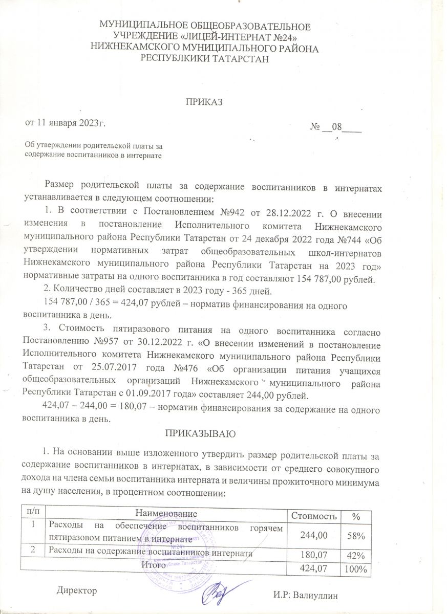 Приказ об утверждении родительской платы за содержание воспитанников в интернате № 8 от 11.01.2023 г.