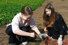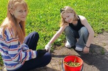 Учащиеся 6в класса вносят свой вклад в благоустройство территории: сражаются с сорняками на стадионе.