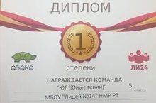 Ахметова Рената (6а), Шведова Анна (6а), Бекбаев Марсель (6н), Мазитова Руфина (6н) - ПРИЗЕРЫ IV Региональной математической игры-конкурса «Абака»! Поздравляем ребят и их учителя математики Кирину Елизавету Викторовну!! Желаем вам дальнейших успехов!! Лицей гордится вашим результатом!!