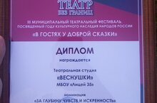 2 июня в ДНТ подвели итоги III муниципального театрального фестиваля «В гостях у доброй сказки» // «Театр без границ». Театральная студия лицея «Веснушки» (6в класс, рук. Казанкова В.Г.) стала победителем в номинации «За глубину чувств и искренность». Поздравляем наших юных актеров и ждём от них новых интересных, ярких постановок.