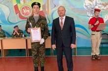 Сегодня в лицее состоялось трогательное мероприятие - передача пальмы первенства старшими юнармейцами будущим юнармейцам. На встрече присутсвовал начальник штаба местного отделения ВВПОД «Юнармия» в Нижнекамске Камалов И.Н., который вручил благодарственные письма командиру действующего юнармейского отряда лицея Яруллину Ильшату, 10а класс, и юнармейцу Нафикову Булату, ученику 9а класса. Куратор юнармейского отряда лицея Скорич Г.И. познакомил с направлениями деятельности юнармейских отрядов, условиями и порядком вступления в отряд.