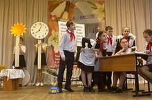Сегодня свои постановки в рамках «Осеннего бала» представили старшеклассники. Так, 9-ые классы показали зрителям самые интересные сцены легендарной мелодрамы К. Тинчурина "Зәңгәр шәл". Эта пьеса стала своего рода символом татарского театра. Зрительский интерес к ней не ослабевает. В основу сюжета легла история, рассказывающая о двух влюбленных – молодом шахтере Булате и простой сельской девушке Майсаре, которые, преодолев все испытания, выпавшие на их долю, обрели семейное счастье. В наши дни спектакль стал визитной карточкой театра имени Г. Камала, который ежегодно открывает и закрывает театральный сезон этой пьесой, написанной в 1926 году.