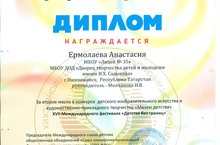 Поздравляем Ермолаеву Анастасию, учащуюся 6д класса, занявшую 2 место в конкурсе детского изобразительного искусства и художественно-прикладного творчества "Мечты детства 17 Международного фестиваля "Детство без границ"