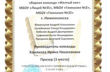 Межрегиональный химический турнир. В сложной борьбе с опытными командами из профильных школ г. Казани, Набережных Челнов, Альметьевска, Агрызского и Дрожжановского районов лицеисты в составе Нижнекамского команды «Желтый кек» заняли 3 место (разделили с МБОУ «Лицей №131» г. Казани). Лицей представляли учащиеся 9 классов: Кобелев Андрей, 9в класс, Сулейманов Тимур, 9а класс, Юмангулов Андрей, 9а класс. Также в команду входили учащиеся гимназии №2, гимназии №32. Подводились итоги и в личном зачете: Кобелев Андрей является призером (3 место) в личном первенстве. Руководитель команды – Хомякова Ирина Николаевна, учитель химии высшей квалификационной категории.