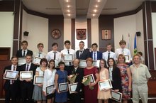 Республиканское торжественное чествование победителей и призеров олимпиад и их педагогов. 19.05.2015 В целях поощрения наиболее одаренных школьников и их педагогов 19 мая 2015 года в концертном зале Учебно-лабораторного корпуса Поволжской государственной академии физической культуры, спорта и туризма (Деревня Универсиады) состоялось торжественное чествование победителей и призеров заключительного этапа всероссийской олимпиады и победителей республиканской олимпиады школьников. На данное мероприятие была приглашена и делегация лицея №35 под руководством директора Зиятдиновой Г.И.: Ахмерова Алина, 9а – абсолютный победитель всероссийской олимпиады по технологии (учитель Торговкина Л.И.), Целоусов Никита,10а – призер всероссийской олимпиады по физике (учитель Салимова И.М.), Кобелев Андрей,8в – победитель республиканской олимпиады по химии (учитель Хомякова И.Н.). Поздравляем лицеистов и их педагогов с высокими победами! МОЛОДЦЫ!