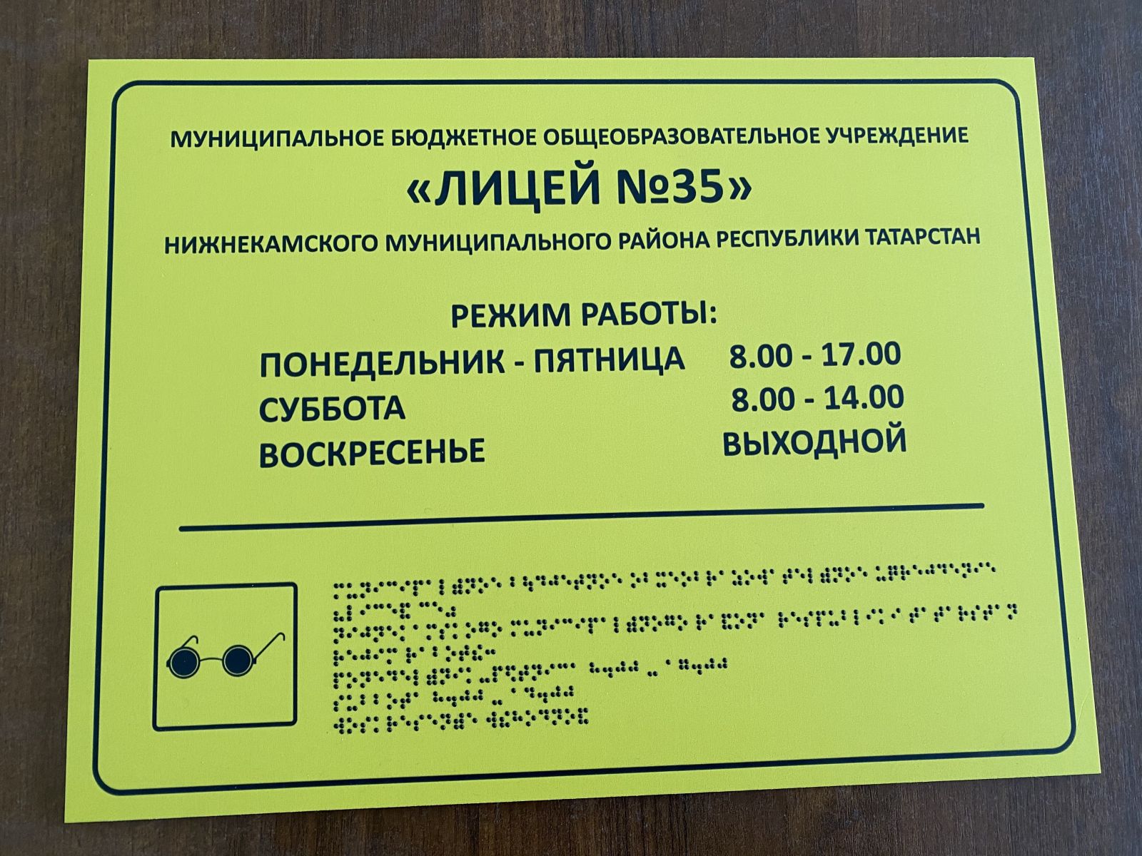 Информация о лицее 35 со шрифтом Брайля для слабовидящих людей у входа в школу
