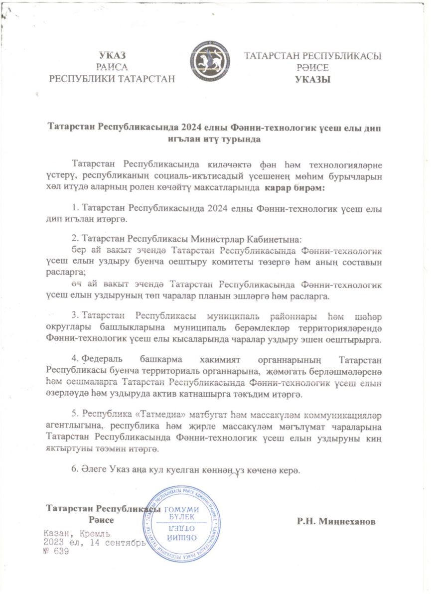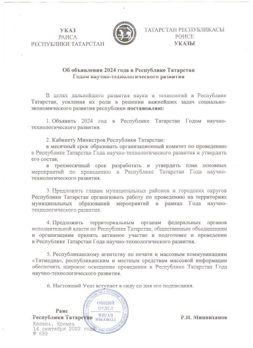 2024 год в Республике Татарстан объявлен Годом научно-технологического развития. 20.10.2023