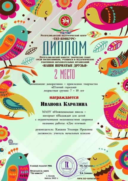 Учащиеся 1 подготовительного класса под руководством учителя начальных классов Капаевой Э. И. приняли участие в Республиканском конкурсе творческих работ "Наши пернатые друзья". Поздравляем Иванову Каролину, занявшую 2 место в номинации "Декоративно-прикладное творчество"!