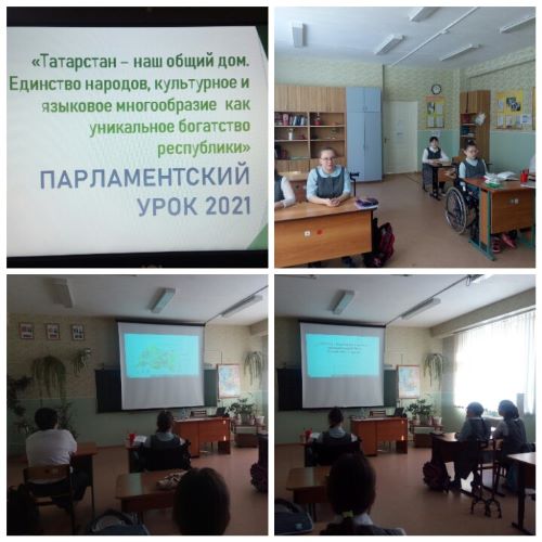 Сегодня прошел парламентский урок для учащихся школы на тему «Татарстан — наш общий дом. Единство народов, культурное и языковое многообразие как уникальное богатство республики», посвященный объявленному в Татарстане Году родных языков и народного единства. Парламентский урок проводился традиционно в целях правового просвещения, воспитания активной гражданской позиции и патриотизма.