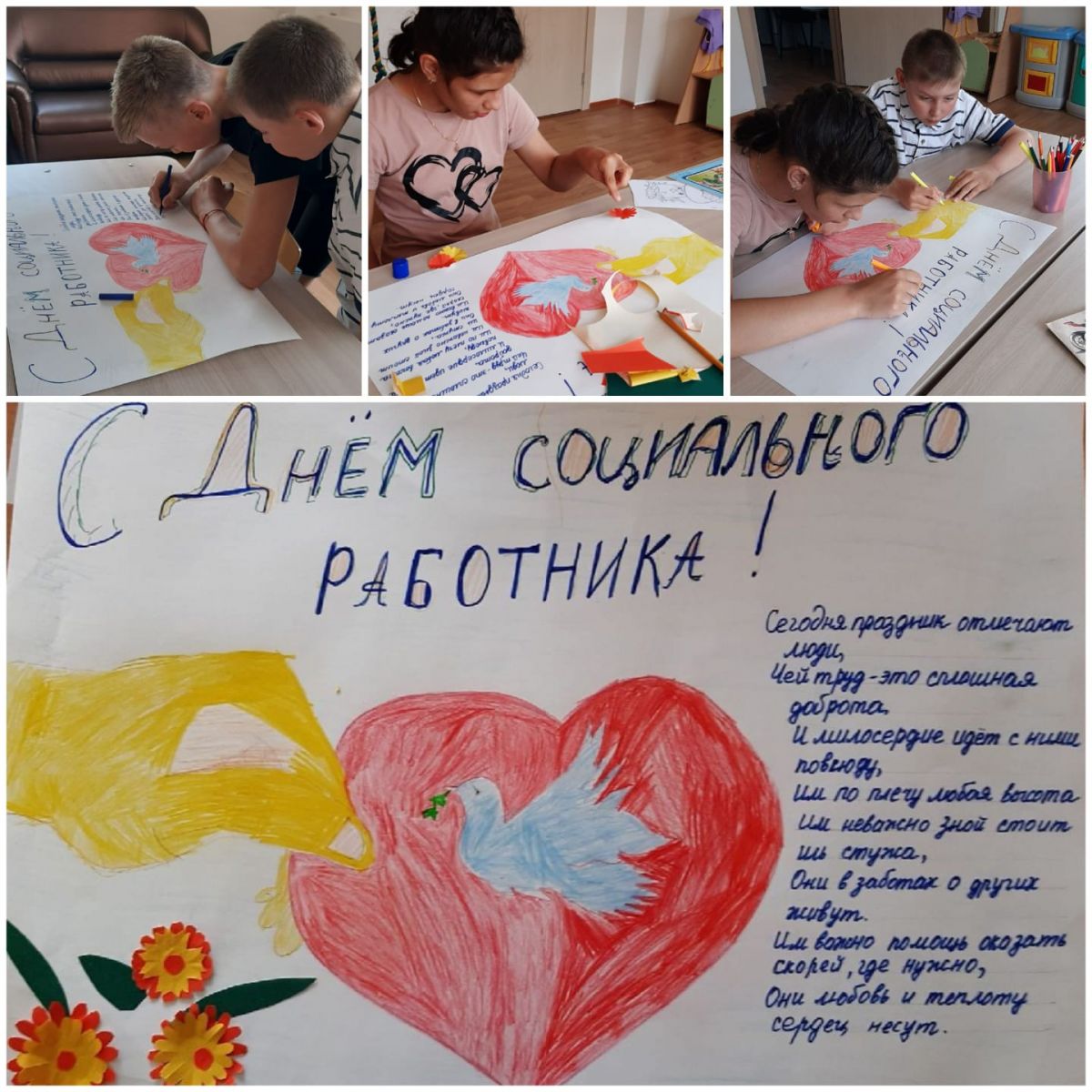 Накануне Дня социального работника ребята из отделения "Центр реабилитации" решили выпустить стенгазету со словами благодарности и ярким рисунком. Предварительно педагоги провели беседу, рассказали чем занимаются люди данной профессии, вместе посмотрели небольшой видеоролик. Дети активно рисовали, разукрашивали и писали. Результат получился отличный!!!