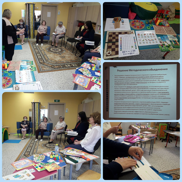 Опубликовано: 21.05.2024Специалистами дошкольного отделения и отделения Центр реабилитации проведено плановое МО по теме "Двигательные техники в работе специального педагога с детьми с ОВЗ в ходе формирования базовых составляющих психического развития - пространственно-временных представлений". По результатам работы МО было внесено решение: рекомендовать систематически использовать в своём направлении работы различные двигательные техники и методы нейропсихологии для разработки адаптированных коррекционно-развиваюших программ для детей с ОВЗ, продолжать активно изучать методы и приёмы нейропсихологии, их особенности и методику проведения в ходе самообразования, обобщить свой опыт работы, продолжать пополнять картотеку играми и упражнениями по формированию и коррекции пространственно-временных представлений у детей с ОВЗ с использованием двигательных техник нейропсихологии в различных режимных моментах образовательного и реабилитационного процессов, в работе с родителями.