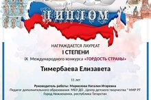 Поздравляем воспитанниц объединения "Изготовление игрушки" Центра детского творчества Тимербаеву Е. (номинация - "Лучше нет родного края"), Вишнякову Т. (номинация - "Пусть детство громкое смеётся") и их педагога Маркелову Н. И. с победой в IX Международном конкурсе "Гордость страны" - Лауреат I степени. Молодцы! Так держать!