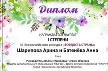 Поздравляем наших воспитанников объединения "Изготовление игрушки" Батенëву Анну и Шарипову Арину с победой на IX Всероссийском конкурсе "Гордость страны" (педагог Маркелова Н. И.)