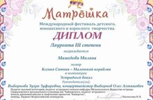 Поздравляем педагога вокального ансамбля "Статус" Выборнову З. З., концертмейстера Выборнова О. А. и нашу юную воспитанницу Мамедову Милану с отличным результатом на Международном фестивале детского, юношеского и взрослого творчества "Матрёшка" - Лауреат III степени (номинация - эстрадный вокал)!