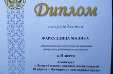 Председатель комитета Сабитова А. Ф. наградила воспитанницу нашего Центра Фархуллину Малику дипломом за почётное II место в конкурсе "Лучший плакат, рисунок, посвящённый Всемирному дню охраны труда".