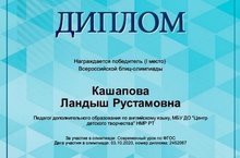 Стали известны результаты Всероссийской блиц-олимпиады по английскому языку «Современный урок по ФГОС». Поздравляем педагога объединения «В мире английского языка» - Кашапову Ландыш Рустамовну с заслуженным I местом! Никогда не останавливайтесь на достигнутом – учитесь, узнавайте новое, развивайтесь. Успехов Вам, вдохновения, творчества и позитива каждый день!