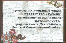 С 04 по 07 мая 2016 года в г. Казань прошло Открытое лично – командное Первенство г. Казани «КАТЮША» по спортивной гимнастике, приуроченное к Дню Победы в ВОВ. Всего 36 участников из городов Нижнекамска, Казани, Зеленодольска, Альметьевска, Тюмени, Южно- Сахалинска.