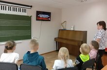 Кама Аланы балалар музыка мәктәбендә Җиңү бәйрәме алдыннан укытучы-оештыручы О.Ю. Калачева сугыш еллары җырлары буенча "Угадай мелодию" уенын үткәрде.