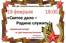19 февраля в 18:00 ч. в актовом зале школы состоится праздничный концерт "Святое дело - Родине служить!", посвященный Дню Защитника Отечества. Мероприятие проводит Файзуллина Ирина Рафаэльевна. В концерте прозвучат произведения в исполнении учащихся школы. Приглашаем всех желающих! Вход свободный.