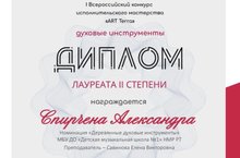 Поздравляем учащихся оркестрового отдела ДМШ №1 с лауреатством в I Всероссийском конкурсе исполнительского мастерства «ART Terra»! 1. Спирчена Александра- лауреат II степени! 2. Бутянов Антон - лауреат II степени! Преподаватель Савинова Елена Викторовна. Город Уфа. Молодцы!