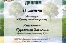 Поздравляем ученицу ДМШ №1 Гурьянову Василису с Дипломом II степени в Четвёртой Международной Олимпиаде по музыкальной грамоте и теории музыки «Четыре четверти»!