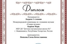 ФГБОУ ВО "Чувашский государственный педагогический университет им. И. Я. Яковлева" и Центр АРТ-образования проводили Международную олимпиаду по слушанию музыки «В мире музыки», где Карпов Марк стал лауреатом I степени!