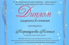 Поздравляем победителя VI Республиканского конкурса-фестиваля детского исполнительства "Семь нот" г. Набережные Челны, в номинации "Научно-практическая конференция учащихся", по теме "Литературное произведение в музыке" Корнаухову Ксению - Лауреата II степени (преп. Размахова Валентина Леонидовна)!