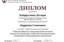 Всероссийский конкурс «Серебряный век» по музыкально-теоретическим дисциплинам, посвященный Международному Дню музыки. В номинации «Зарубежная музыкальная литература» Хайруллина Диляра заняла Лауреат 1 степени.