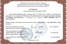 - Свидетельство судейской квалификации третьей категории Федерации педагогов вокального искусства. -