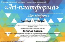 29 ноября 2020г. в г.Казань прошел Международный конкурс творческих дарований «Art-платформа» где учащийся МБУ ДО «ДМШ № 4» НМР РТ Зарипов Равиль стал Лауреатом II степени в номинации «Инструментальное исполнительство. Классическое исполнительство» «Флейта. Соло»