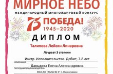 15 мая 2020 года, прошел Международный многожанровый конкурс "Мирное небо", где учащаяся ДМШ № 4, Талипова Лейсян, стала лауреатом III степени в номинации "Инструментальное исполнительство. Соло. Дебют, 7-8 лет." (преподаватель Давыдова Е.А.).