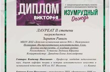 25 октября 2020 г. в г. Набережные Челны прошел I Международный фестиваль-конкурс детского и юношеского творчества «Изумрудный Дождь» где учащийся МБУ ДО «ДМШ № 4» НМР РТ Зарипов Равиль стал Лауреатом II степени в номинации Инструментальное исполнительство. Соло. Духовые инструменты «1 младшая группа» (Флейта).