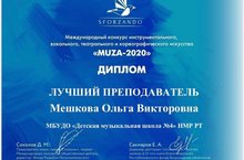 12 апреля 2020 года, прошел Международный конкурс инструментального, вокального, театрального и хореографического искусства "MUZA - 2020" (г.Казань), где преподаватель ДМШ № 4, Мешкова Ольга Викторовна, получила диплом "Лучший преподаватель".