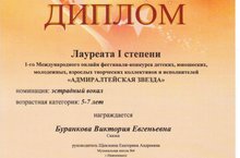 30 апреля 2020 года, прошел Международный онлайн фестиваль-конкурс детских, юношеских, молодежных, взрослых творческих коллективов и исполнителей "Адмиралтейская звезда" (г.Санкт-Петербург), где учащаяся ДМШ № 4, Буранкова Виктория, стала лауреатом I степени в номинации "Эстрадный вокал. Соло." (преподаватель Щеклеина Е.А.).