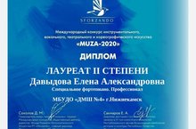 12 апреля 2020 года, прошел Международный конкурс инструментального, вокального, театрального и хореографического искусства "MUZA - 2020" (г.Казань), где преподаватель ДМШ № 4, Давыдова Елена Александровна, стала лауреатом II степени в номинации "Специальное фортепиано. Соло. Профессионал.".